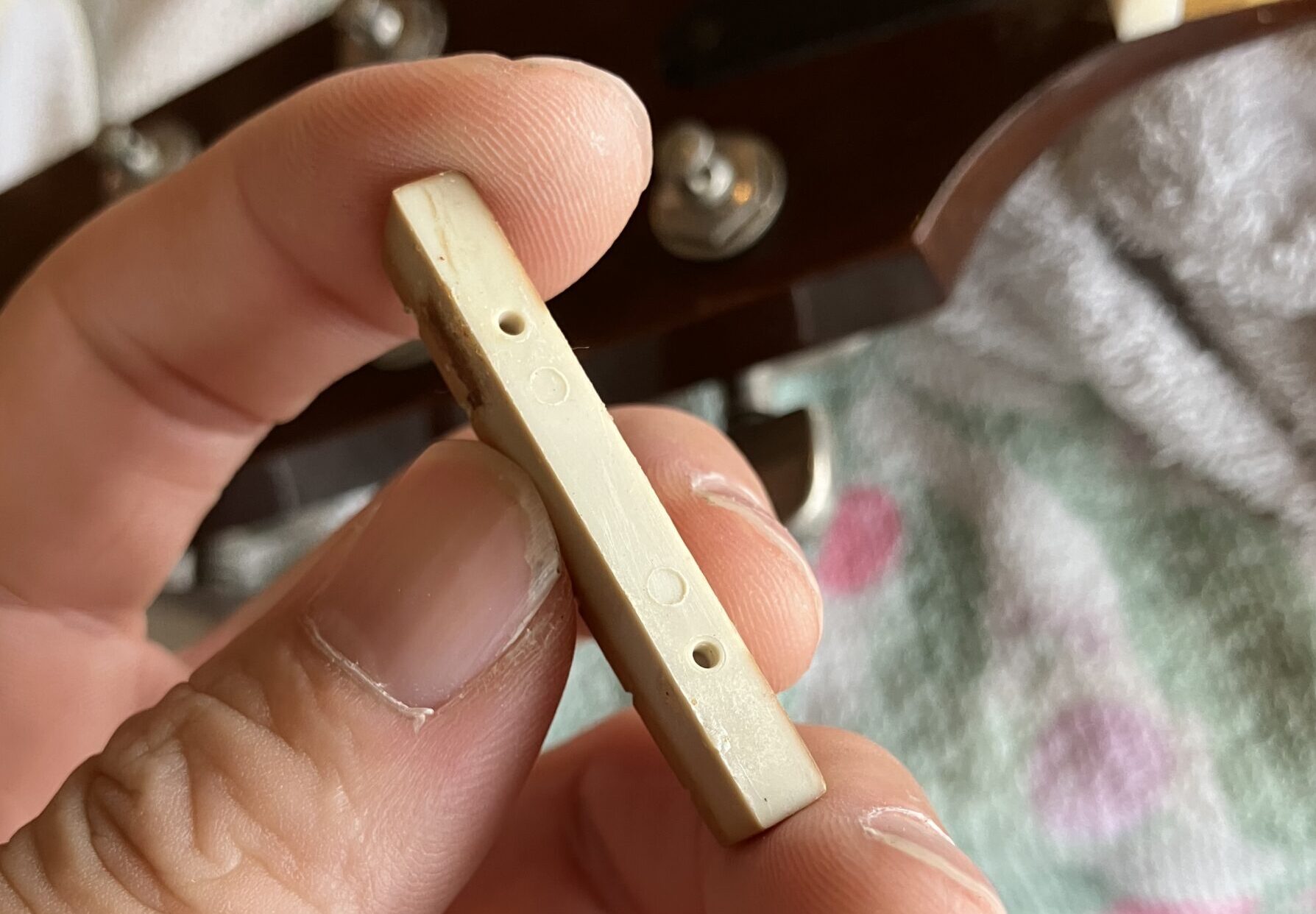 こちらの画像はナットを作り変えている途中ですが、手に持っているナットの裏を見ると穴が開いています。